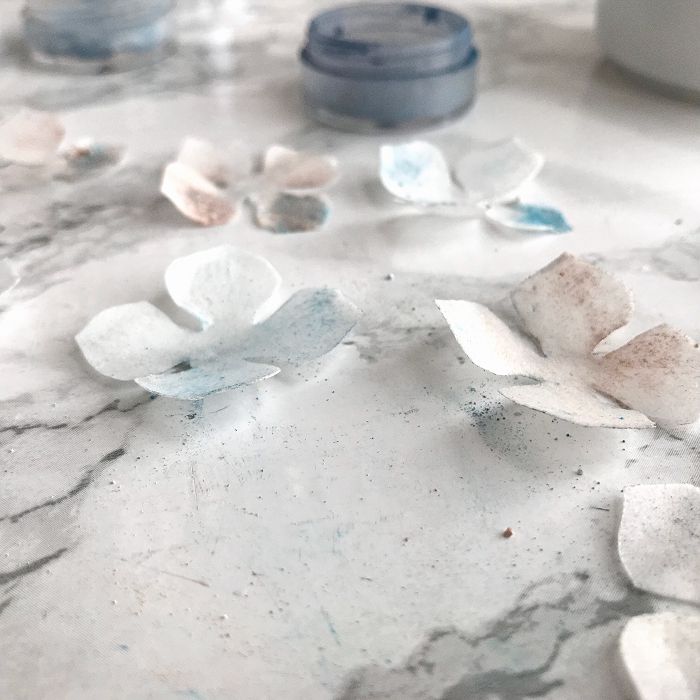 Вырезанные лепестки гортензии смачиваем небольшим количеством водки с помощью широкой кисти. Поверх проходимся сухой широкой кистью с цветочной пыльцой. Старайтесь окрашивать лепестки не в сплошной цвет, а пятнами, слегка прикасаясь кистью.