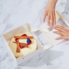 Придайте коробке форму, поместите десерт внутрь и закройте крышку.