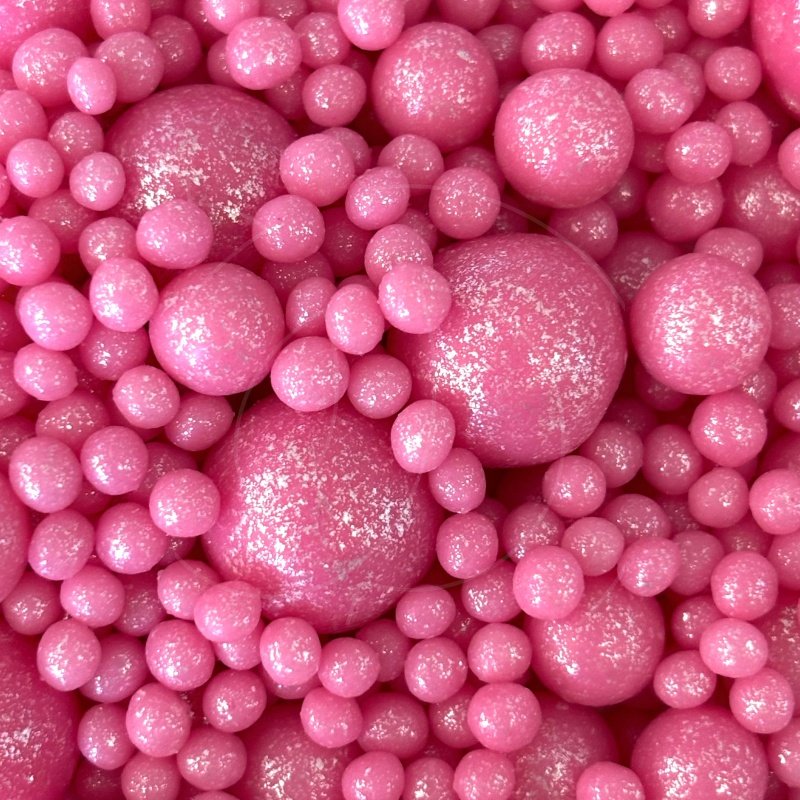 Жемчужная посыпка покрыта ярким пищевым блеском розового цвета.