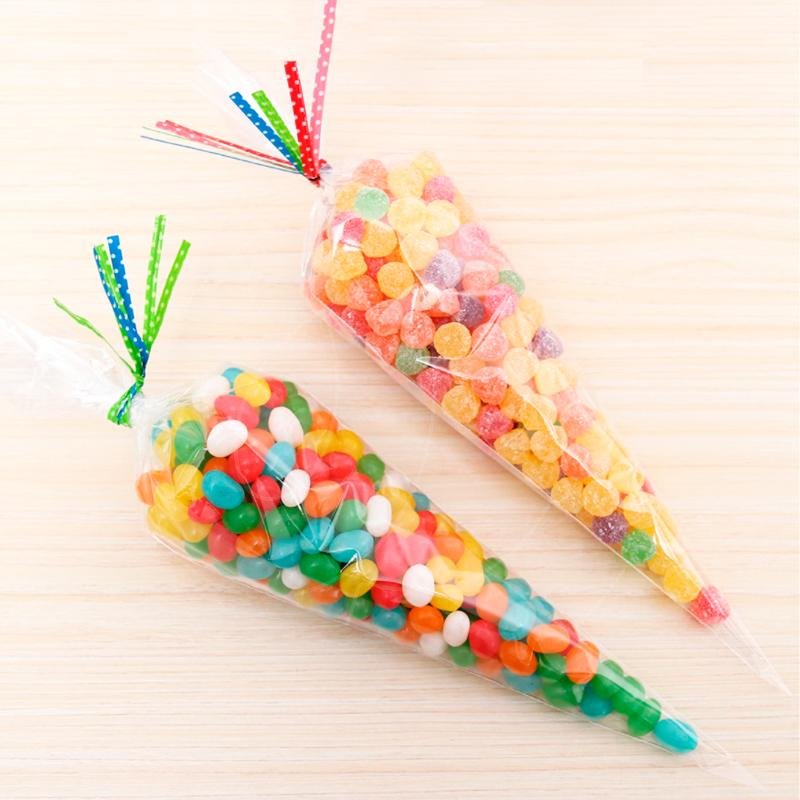Прозрачный пакет в форме конуса подходит для упаковки пряников, леденцов, безе, печенья и прочих кондитерских изделий.